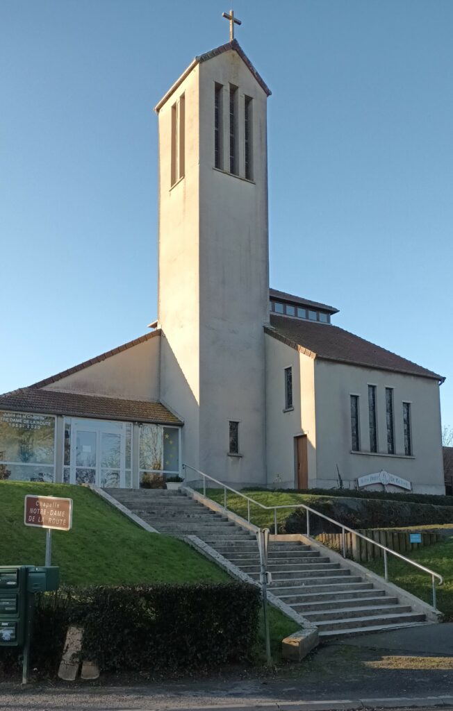 La chapelle Notre-Dame de la Route fut consacrée le dimanche 22 novembre 1953 en présence de l’évêque de Bayeux (7). La chapelle fut construite entre juin 1952 et novembre 1953. Les habitants et cheminots du village de la Gare s’étaient mobilisés par de nombreuses actions afin de financer la construction de celle-ci, sous l’impulsion de l’abbé Ernest Villain, curé de Sainte-Marguerite de 1943 à 1954, et de l’AEP, Association d’Education Populaire, présidée par Mr Galliot et. Ils ouvrirent un cinéma, l’Optima, le 2 décembre 1946 au quartier de la Gare, pour aider au financement (7). Son bâtiment abrite aujourd’hui l’entreprise Pixi.