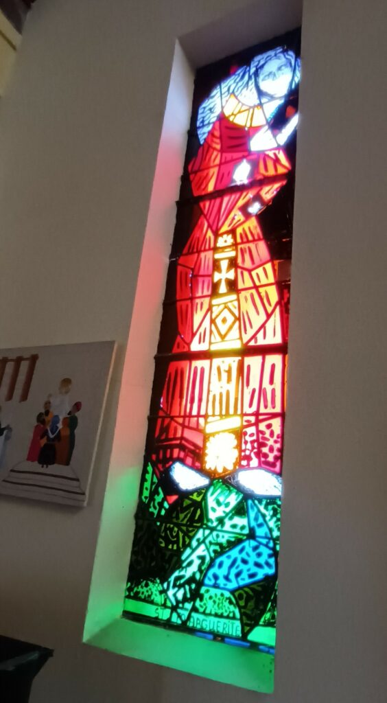 Chapelle Notre-Dame de la Route, vitrail Sainte-Marguerite, plaque à la mémoire du chanoine Villain (G.L.)