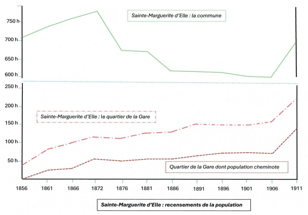 - Sur Sainte-Marguerite d’Elle, le recensement de 1861 (2) comptait 14 cheminots, soit 27 personnes liées au monde cheminot :