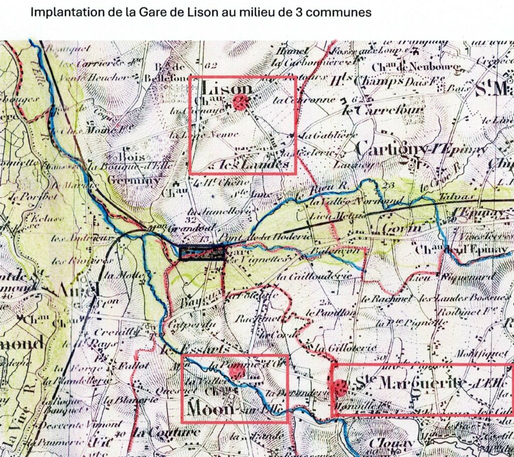 La gare de Lison, implantée au milieu de trois communes et deux départements, une situation administrative complexe, se trouvait éloignée des bourgs respectifs de Lison, Moon et Sainte-Marguerite-d’Elle, ces derniers situés à 2 ou 3 km.