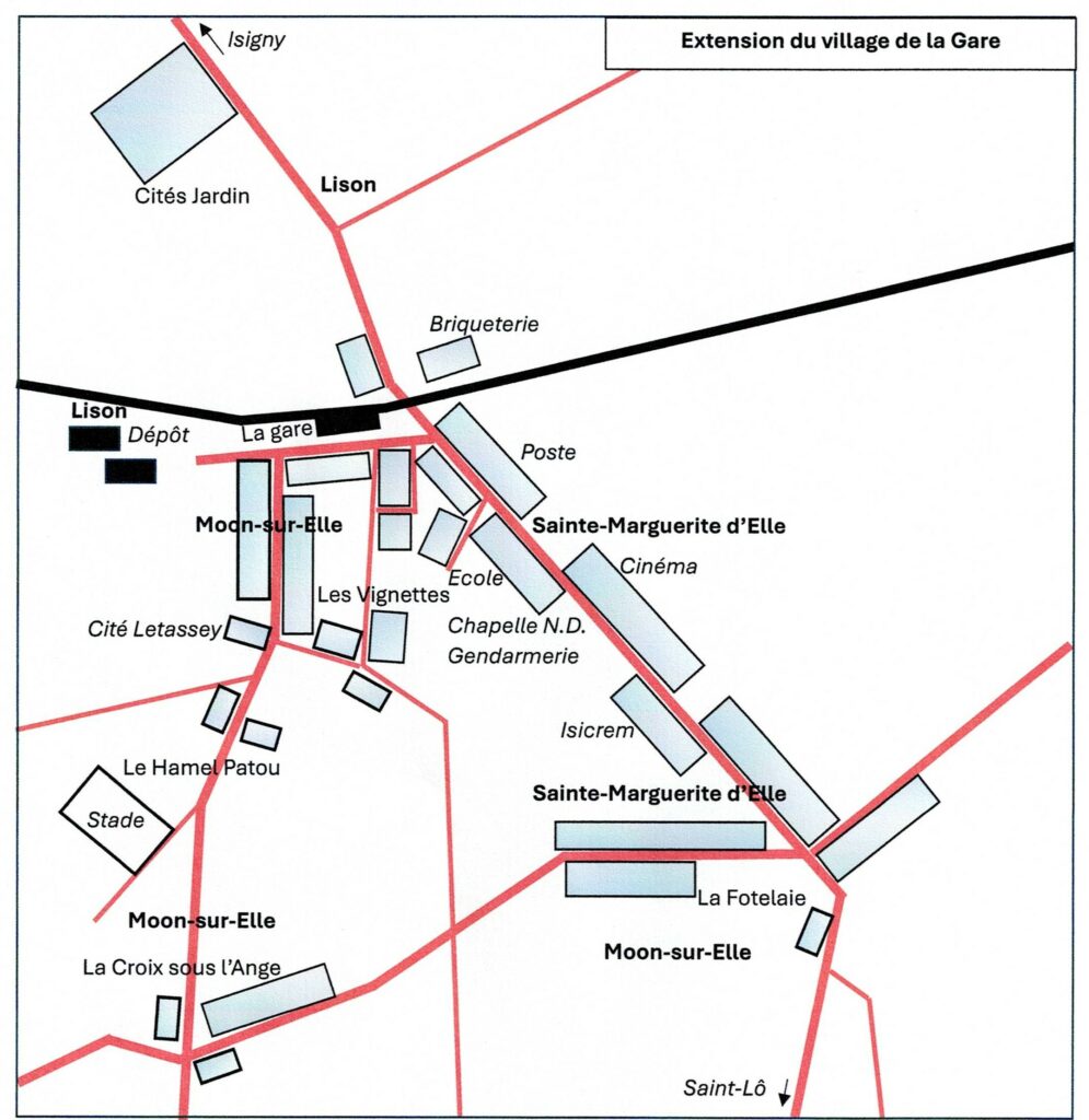 Les constructions s’étendirent le long de l’axe Isigny – Saint-Lô jusqu’à la Fotelaie sur Sainte-Marguerite, et le long de la D 91 sur Moon vers les hameaux du Hamel-Patou et de La Fontaine. A la fin du XIXe siècle, la population cheminote représentait plus de la moitié de la population du quartier appelé désormais Quartier de la Gare.